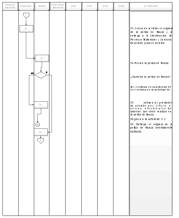 | Persona titular de la Subdirección de Recursos Materiales y Servicios Generales | 54. Revisa la póliza de fianza. ¿Aprueba la póliza de fianza? No. Continúa en la actividad 55. Sí. Continúa en la actividad 56. | Póliza de fianza (anexo VI) |