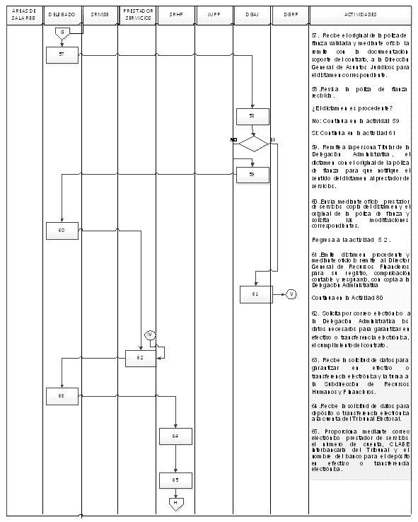 | Persona titular de la Delegación Administrativa | 60. Envía mediante oficio al prestador de servicios copia del dictamen y el original de la póliza de fianza y solicita las modificaciones correspondientes. Regresa a la actividad 52. | Oficio |