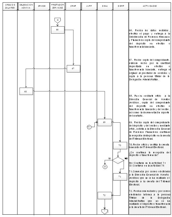 | Persona titular de la Subdirección de Recursos Humanos y Financieros | 64. Recibe la solicitud de datos para depósito o transferencia electrónica a la cuenta del Tribunal Electoral. 65. Proporciona mediante correo electrónico al prestador de servicios, el número de cuenta, CLABE interbancaria del Tribunal Electoral y el nombre del banco para el depósito en efectivo o transferencia electrónica. | Correo electrónico |
