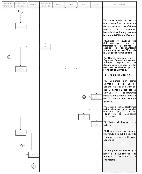 | Persona titular de la Delegación Administrativa | 73. Informa mediante oficio o correo electrónico al prestador de servicios que su depósito en efectivo o transferencia bancaria no se ha registrado en la cuenta del Tribunal Electoral. | Oficio o correo electrónico |