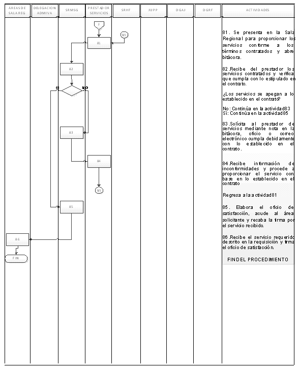 | Áreas de la Sala Regional | 86. Recibe el servicio requerido descrito en la requisición y firma el oficio de satisfacción. | Oficio de satisfacción del servicio recibido |
