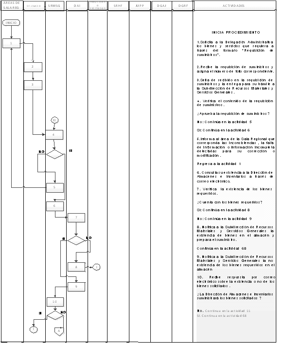 | Persona titular de la Subdirección de Recursos Materiales y Servicios Generales | 4. Verifica el contenido de la requisición de suministros. ¿Aprueba la requisición de suministros? No. Continúa en la actividad 5. Sí. Continúa en la actividad 6. 5. Informa al área de la Sala Regional que corresponda las inconsistencias, la falta de información o información incompleta para su corrección o modificación. Regresa a la actividad 1. 6. Consulta la existencia a la Dirección de Almacenes e Inventarios a través de correo electrónico. | Requisición de suministros (anexo I) Correo electrónico | ||