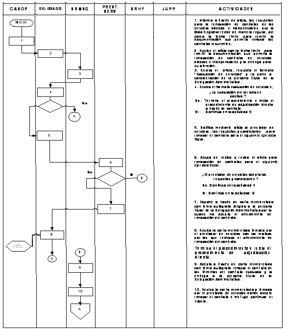 | Persona titular de la Delegación Administrativa | 8. Revisa carta membretada firmada por el prestador de servicios con los motivos por los que rechaza el ofrecimiento de renovación del contrato. Termina el procedimiento e inicia el procedimiento de adjudicación directa | Carta de motivos de no aceptación |