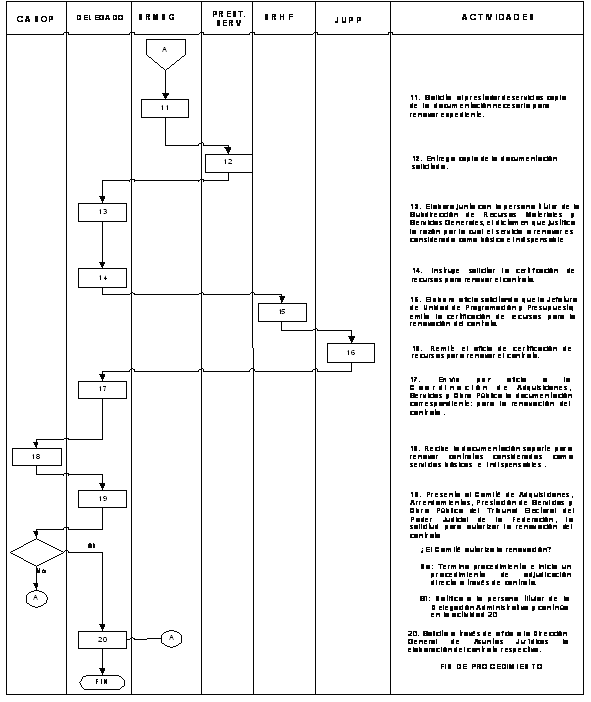 | Persona titular de la Coordinación de Adquisiciones, Servicios y Obra Pública | 18. Recibe la documentación soporte para renovar contratos considerados como servicios básicos e indispensables. 19. Presenta al Comité de Adquisiciones, Arrendamientos, Prestación de Servicios y Obra Pública del Tribunal Electoral del Poder Judicial de la Federación, la solicitud para autorizar la renovación del contrato ¿El Comité autoriza la renovación? No. Termina procedimiento e inicia un procedimiento de adjudicación directa a través de contrato. Sí. Notifica a la persona titular de la Delegación Administrativa y continúa en la actividad 20. 20. Solicita a través de oficio a la Dirección General de Asuntos Jurídicos la elaboración del contrato respectivo. | Documentación Instrucción del Comité de Adquisiciones, Arrendamientos, Prestación de Servicios y Obra Pública Oficio |