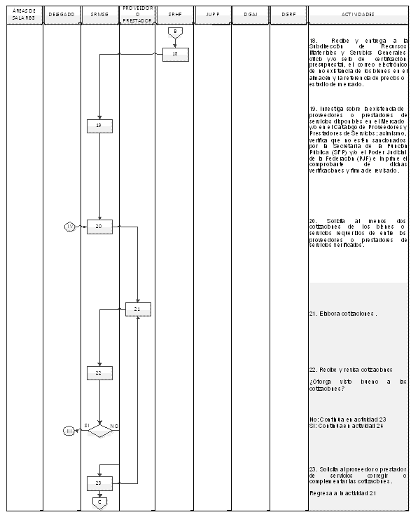 | Persona titular de la Subdirección de Recursos Materiales y Servicios Generales | 22. Recibe y revisa cotizaciones. ¿Otorga visto bueno a las cotizaciones? No. Continúa en la actividad 23. Sí. Continúa en la actividad 24. 23. Solicita al proveedor o prestador de servicios corregir o complementar las cotizaciones. Regresa a la actividad 21. 24. Elabora el cuadro comparativo. 25. Firma el cuadro comparativo y entrega a la persona titular de la Delegación Administrativa con las cotizaciones recibidas para su aprobación. | Cotización revisada Cuadro comparativo (anexo II) |
