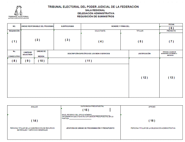 | 1 2 3 4 5 6 7 8 9 10 11 12 13 14 15 16 | No. Requisición Unidad responsable del programa Subprograma Solicitante Titular Fecha Proyecto Número consecutivo Cantidad solicitada Unidad de medida Descripción específica del bien o servicio Justificación Persona a quien se asignará el bien o servicio Analizó Suficiencia presupuestal Aprobó | La SUBDIRECCIÓN DE RECURSOS MATERIALES Y SERVICIOS GENERALES anotará el número de folio consecutivo de control que se le asigna a la requisición, considerando el número 1 al inicio del ejercicio. Anotar el nombre de la unidad solicitante responsable del programa. Anotar el subprograma correspondiente. Anotar el nombre completo y firma del solicitante. Asentar en este espacio el nombre completo y la firma del titular de la unidad solicitante. Anotar la fecha (día, mes y año) en que la unidad solicitante requisita el formato. Anotar el Nombre del Proyecto si es que existe, si no anotar N/A. Anotar el número consecutivo que le corresponde a cada artículo solicitado. Anotar la cantidad solicitada por cada artículo, material o suministro listado. Anotar la unidad de medida de los materiales y suministros que se están solicitando (pieza, paquete, metros, cajas). Anotar en forma clara, precisa y completa las especificaciones de cada uno de los bienes o servicios requeridos. Asentar una breve justificación del porque se requiere el bien solicitado. Anotar el nombre de la persona a quien se asignarán los bienes o servicios solicitados. Asentar la firma de la persona titular de la Subdirección de Recursos Materiales y Servicios Generales, responsable de analizar las requisiciones recibidas para su atención. Anotar el número de oficio de la Jefatura de Programación y Presupuesto en donde emite la suficiencia presupuestal para la Sala Regional. Asentar la firma de la persona titular de la Delegación Administrativa, en señal de que la requisición es procedente. |