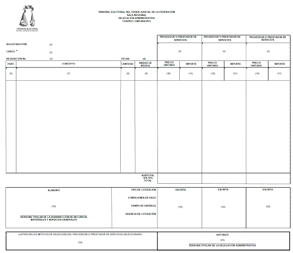 | 1 2 3 4 5 6 7 8 9 10 11 12 13 14 15 | Solicitado por Cargo Requisición No. Fecha Proveedores o Prestadores de servicios Partida Material Cantidad Unidad de medida Precio unitario Importe Condiciones de venta Elaboró Justificación Autorizó | Anotar el nombre de la unidad que solicita o envía la requisición de suministros. Anotar el puesto del solicitante del bien o servicio Anotar el número de control interno que se asigna a la requisición de suministros. Anotar la fecha de elaboración del cuadro comparativo. Anotar el nombre de cada proveedor/prestador de servicios, según las cotizaciones recibidas. Anotar el número consecutivo según la(s) partida(s) solicitada(s) en la requisición de suministros. Describir los bienes o servicios solicitados en la requisición de suministros, de acuerdo a cada partida. Anotar el número de bienes solicitados por partida, según la requisición de suministros. Anotar la unidad de medida (PQ. PZA, JGO, LT, K, MTS.), correspondiente a cada partida o bien solicitado. Anotar el precio unitario cotizado por partida y proveedor antes del IVA. Anotar el subtotal que le corresponde a cada partida de acuerdo al precio unitario por el total de bienes o servicios solicitados, antes de IVA, por cada uno de los proveedores/prestadores de servicios que cotizaron. Anotar, por proveedor/prestador de servicios, las condiciones de venta según se indica en su cotización. C=Tipo de cotización. CP=Condiciones de pago. TE=Tiempo de entrega. VG=Vigencia de la cotización. Asentar el nombre y firma autógrafa de la persona titular de la Subdirección de Recursos Materiales y Servicios Generales, en señal de elaboración del cuadro comparativo. Asentar el nombre del proveedor o prestador del servicio y señalar los motivos que justifiquen la selección. Asentar el nombre y firma autógrafa de la persona titular de la Delegación Administrativa, en señal de autorización de la adjudicación. |