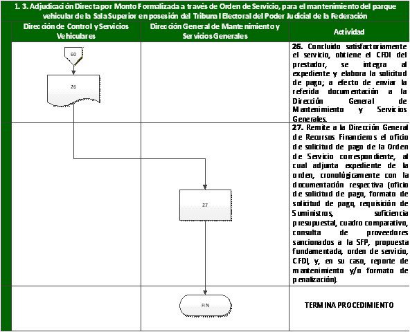 | Dirección de Control y Servicios Vehiculares | 26. Concluido satisfactoriamente el servicio, obtiene el CFDI del prestador, se integra al expediente y elabora la solicitud de pago; a efecto de enviar la referida documentación a la Dirección General de Mantenimiento y Servicios Generales. | Solicitud de pago |