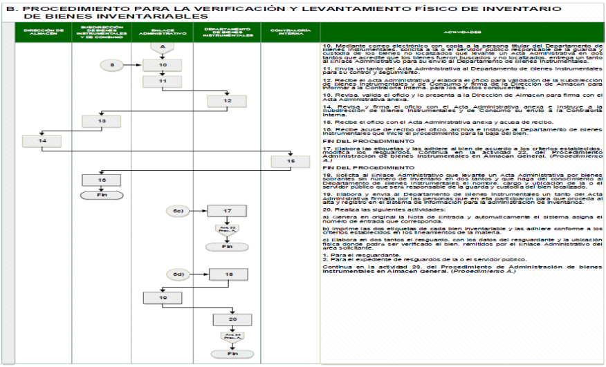 | Enlace Administrativo | 19. Elabora y envía al Departamento de Bienes Instrumentales un tanto del Acta Administrativa firmada por las personas que en ella participaron para que proceda al alta y registro en el sistema de información para la administración de inventarios. | Acta Administrativa firmada |