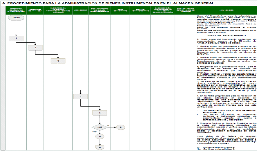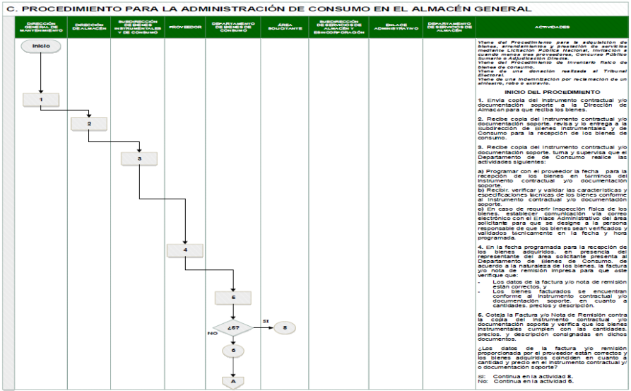 | Subdirección de Bienes Instrumentales y de Consumo | 3. Recibe copia del instrumento contractual y/o documentación soporte turna y supervisa que el Departamento de Bienes de Consumo realice las actividades siguientes: a) Programar con el proveedor la fecha para la recepción de los bienes en términos del instrumento contractual y/o documentación soporte, b) Recibir, verificar y validar las características y especificaciones técnicas de los bienes conforme al instrumento contractual y/o documentación soporte. c) En caso de requerir inspección física de los bienes, establecer comunicación vía correo electrónico con el Enlace Administrativo del área solicitante para que se designe a la persona responsable de que los bienes sean verificados y validados técnicamente en la fecha y hora programada. | Copia del Instrumento Contractual y/o documentación soporte |
