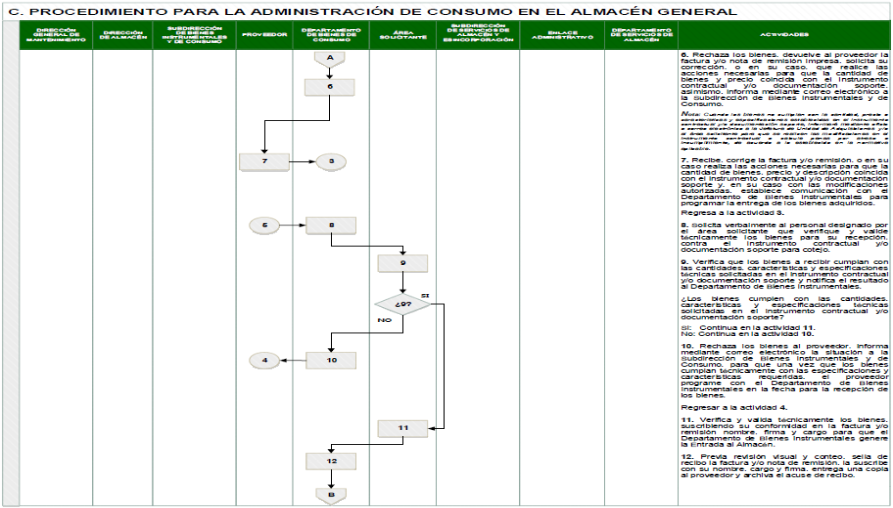 | Proveedor | 7. Recibe, corrige la factura y/o remisión, o en su caso realiza las acciones necesarias para que la cantidad de bienes, precio y descripción coincida con el instrumento contractual y/o documentación soporte y, en su caso con las modificaciones autorizadas, establece comunicación con el Departamento de Bienes de Consumo para programar la entrega de los bienes adquiridos. Regresa a la actividad 3. | Copia del Instrumento Contractual y/o documentación soporte Factura y/o remisión |