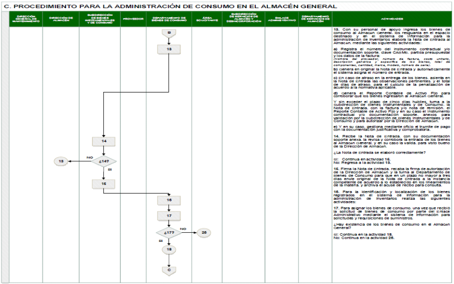 | Subdirección de Bienes Instrumentales y de Consumo | 14. Recibe la Nota de Entrada, con su documentación soporte anexa, la revisa y corrobora la entrada de los bienes al Almacén General, y en su caso la valida, para visto bueno de la Dirección de Almacén. ¿La Nota de Entrada se elaboró correctamente? Si: Continua en actividad 15. No: Regresa a la actividad 13. | Nota de Entrada y su documentación soporte |