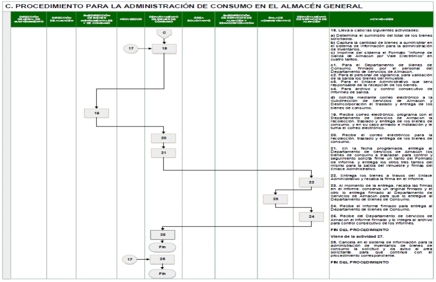 | Departamento de Bienes de Consumo | 18. Lleva a cabo las siguientes actividades: a) Determina el suministro del total de los bienes solicitados. b) Captura la cantidad de bienes a suministrar en el sistema de información para la administración de inventarios, c) Imprime del sistema el Formato "Informe de Salida de Almacén por Vale Electrónico" en cuatro tantos. c1 Para el Departamento de Bienes de Consumo, firmado por el personal del Departamento de Servicios de Almacén. c2 Para el personal de vigilancia, para validación de la salida los bienes del inmueble. c3 Para el Enlace Administrativo que será responsable de la recepción de los bienes. c4 Para archivo y control consecutivo de informes de salida. d) Solicita mediante correo electrónico a la Subdirección de Servicios de Almacén y Desincorporación el traslado y entrega de los bienes de consumo. | Informe de Salida de Almacén por Vale Electrónico Correo electrónico |