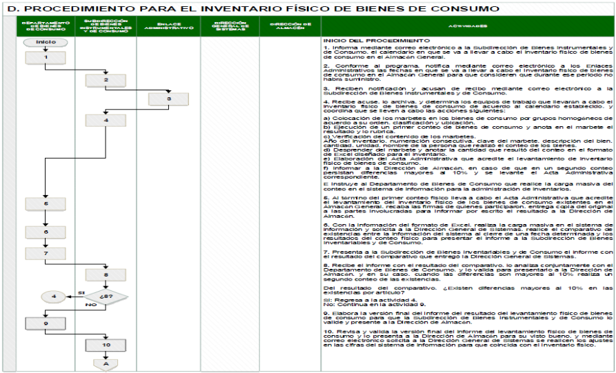 | Subdirección de Bienes Instrumentales y de Consumo | 4. Recibe acuse, lo archiva, y determina los equipos de trabajo que llevarán a cabo el inventario físico de bienes de consumo de acuerdo al calendario establecido, y coordina que se lleven a cabo las acciones siguientes: a) Colocación de los marbetes en los bienes de consumo por grupos homogéneos de acuerdo a su orden, clasificación y ubicación. b) Ejecución de un primer conteo de bienes de consumo y anota en el marbete el resultado y lo rubrica. c) Verificación del contenido de los marbetes. Año del inventario, numeración consecutiva, clave del marbete, descripción del bien, cantidad, unidad, nombre de la persona que realizó el conteo de los bienes. d) Desprender del marbete y anotar la cantidad que resultó del conteo en el formato de Excel diseñado para el inventario. e) Elaboración del Acta Administrativa que acredite el levantamiento de inventario físico de bienes de consumo. f) Informar a la Dirección de Almacén, en caso de que en un segundo conteo persistan diferencias mayores al 10% y se levante el Acta Administrativa correspondiente. E instruye al Departamento de Bienes de Consumo que realice la carga masiva del conteo en el sistema de información para la administración de inventarios. | Acuse de Correo electrónico Marbetes Acta Administrativa |