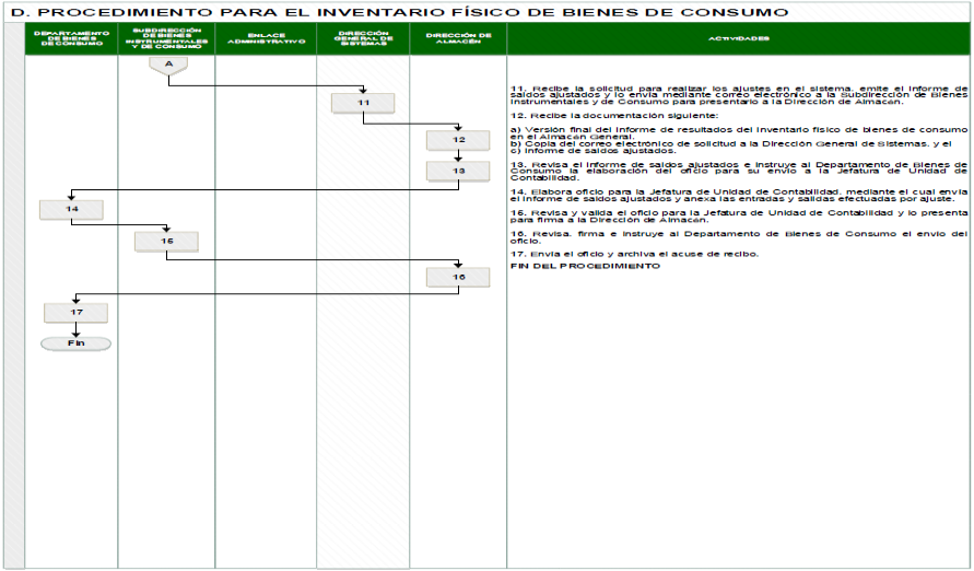 | Dirección de Almacén | 12. Recibe la documentación siguiente: a) Versión final del informe de resultados del inventario físico de bienes de consumo en el Almacén General, b) Copia del correo electrónico de solicitud a la Dirección General de Sistemas, y el c) Informe de saldos ajustados. | Informe de Resultados Correo electrónico Informe de Saldos Ajustados |
