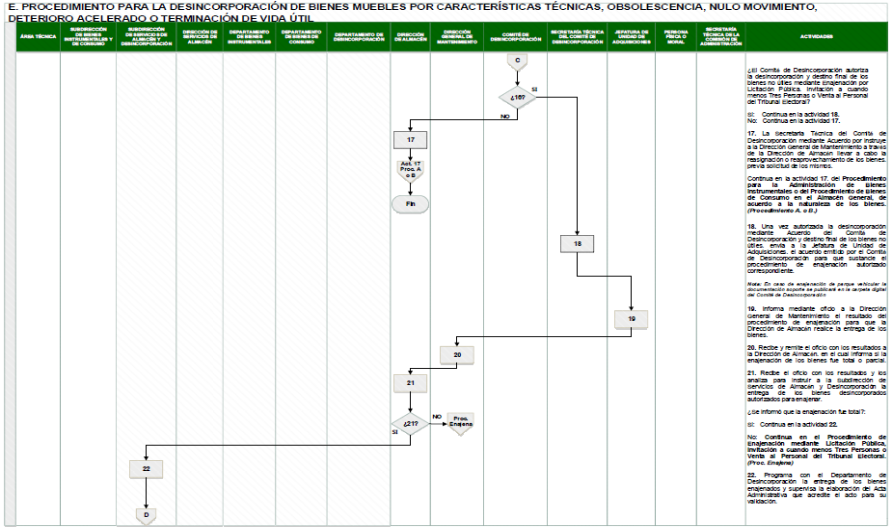 | Comité de Desincorporación | 16. Analiza y evalúa el Punto de Acuerdo para autorizar la desincorporación y el destino final de los bienes no útiles en apego a la normativa aplicable. ¿El Comité de Desincorporación autoriza la desincorporación y destino final de los bienes no útiles mediante Enajenación por Licitación Pública, Invitación a cuando menos Tres Personas o Venta al Personal del Tribunal Electoral? Si: Continua en la actividad 18. No: Continua en la actividad 17. | Punto de Acuerdo Acuerdo del Comité |
