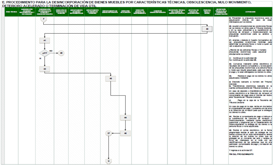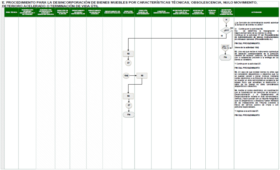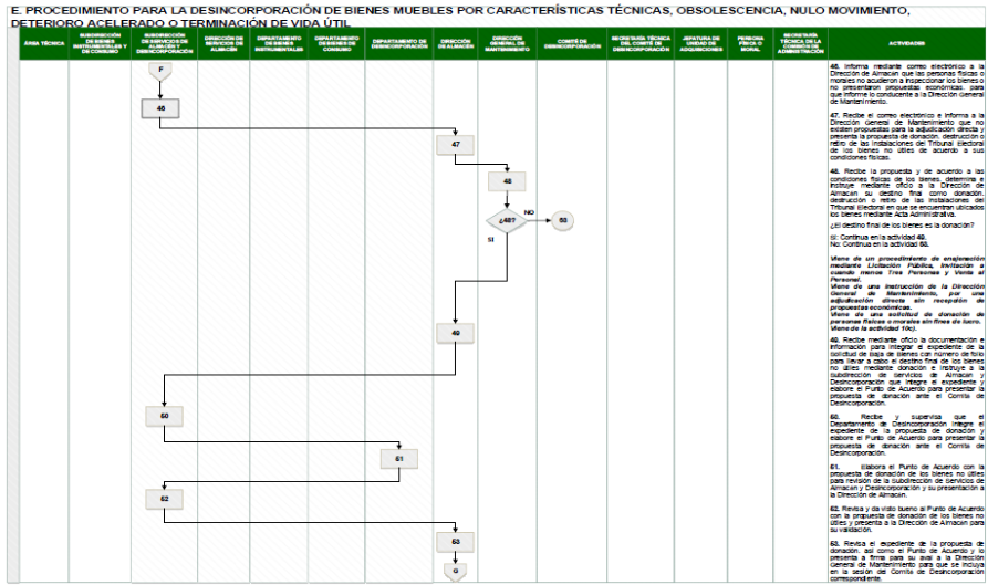 | Dirección General de Mantenimiento | 48. Recibe la propuesta y de acuerdo a las condiciones físicas de los bienes, determina e instruye mediante oficio a la Dirección de Almacén su destino final como donación, destrucción o retiro de las instalaciones del Tribunal Electoral en que se encuentran ubicados los bienes mediante Acta Administrativa. ¿El destino final de los bienes es la donación? Si: Continua en la actividad 49. No: Continua en la actividad 63. | Oficio Acta Administrativa |