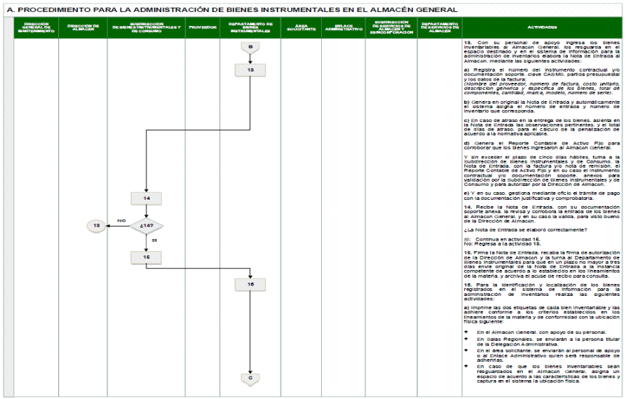 | Departamento de Bienes Instrumentales | 13. Con su personal de apoyo ingresa los bienes inventariables al Almacén General, los resguarda en el espacio destinado y en el sistema de información para la administración de inventarios elabora la Nota de Entrada al Almacén, mediante las siguientes actividades: a) Registra el número del instrumento contractual y/o documentación soporte, clave CABMS, partida presupuestal y los datos de la factura: (Nombre del proveedor, número de factura, costo unitario, descripción genérica y específica de los bienes, total de componentes, cantidad, marca, modelo, número de serie). b) Genera en original la Nota de Entrada y automáticamente el sistema asigna el número de entrada y número de inventario que corresponda. c) En caso de atraso en la entrega de los bienes, asienta en la Nota de Entrada las observaciones pertinentes, y el total de días de atraso, para el cálculo de la penalización de acuerdo a la normativa aplicable. d) Genera el Reporte Contable de Activo Fijo para corroborar que los bienes ingresaron al Almacén General. Y sin exceder el plazo de cinco días hábiles, turna a la Subdirección de Bienes Instrumentales y de Consumo, la Nota de Entrada, con la factura y/o nota de remisión, el Reporte Contable de Activo Fijo y en su caso el instrumento contractual y/o documentación soporte, anexos para validación por la Subdirección de Bienes Instrumentales y de Consumo y para autorizar por la Dirección de Almacén. e) Y en su caso, gestiona mediante oficio el trámite de pago con la documentación justificativa y comprobatoria. | Nota de Entrada Copia del Instrumento Contractual y/o documentación soporte Factura y/o Nota de Remisión Reporte Contable de Activo Fijo Correo electrónico Oficio y documentación justificativa y comprobatoria |