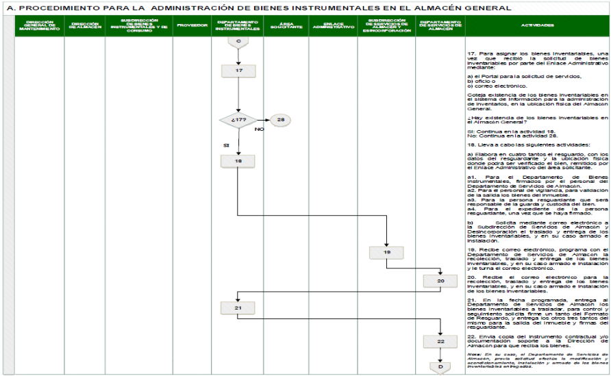 | Departamento de Bienes Instrumentales | 17. Para asignar los bienes inventariables, una vez que recibió la solicitud de bienes inventariables por parte del Enlace Administrativo mediante: a) el Portal para la solicitud de servicios, b) oficio o c) correo electrónico. Coteja existencia de los bienes inventariables en el sistema de información para la administración de inventarios, en la ubicación física del Almacén General. ¿Hay existencia de los bienes inventariables en el Almacén General? Si: Continua en la actividad 18. No: Continua en la actividad 28. | Solicitud de bienes instrumentales |