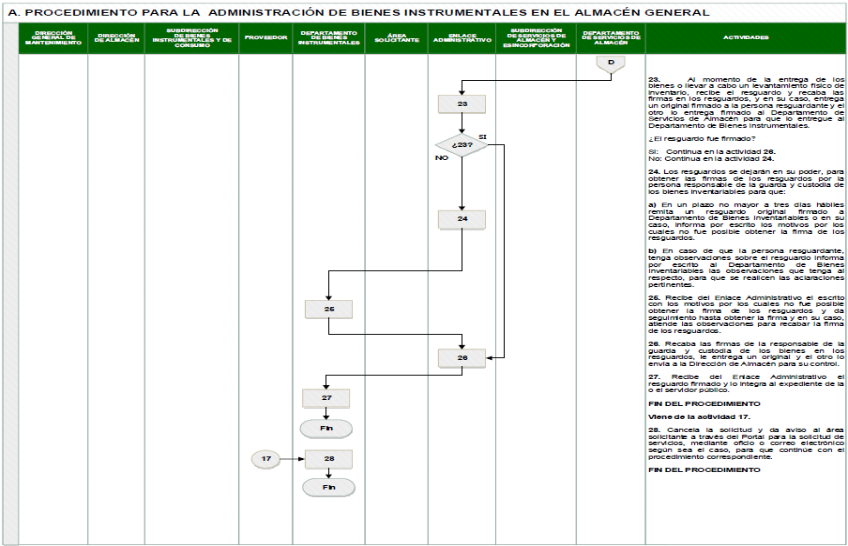| Enlace Administrativo | 23. Al momento de la entrega de los bienes o llevar a cabo un levantamiento físico de inventario, recibe el resguardo y recaba las firmas en los resguardos, y en su caso, entrega un original firmado a la persona resguardante y el otro lo entrega firmado al Departamento de Servicios de Almacén para que lo entregue al Departamento de Bienes Instrumentales. ¿El resguardo fue firmado? Si: Continua en la actividad 26. No: Continua en la actividad 24. | Resguardos |