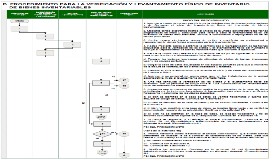 | Departamento de Bienes Instrumentales | 5. Recibe la instrucción y realiza con su personal de apoyo las siguientes actividades para la verificación y el levantamiento físico de bienes: a) Preparar las lectoras, impresoras de etiquetas de código de barras, impresoras láser y los equipos portátiles. b) Cargar la base de datos actualizada en los equipos portátiles para que al momento de la lectura se identifiquen los bienes localizados y faltantes. c) Elaborar el Acta Administrativa que acredite el inicio y de cierre del levantamiento de inventario físico. d) Instruye a su personal de apoyo para que, en las instalaciones de la unidad administrativa, inicie el levantamiento de inventario físico. e) Una vez concluida la verificación de los bienes y el levantamiento físico del inventario, con su personal de apoyo firma el Acta Administrativa del levantamiento físico de inventario de bienes inventariables. | Acta Administrativa |