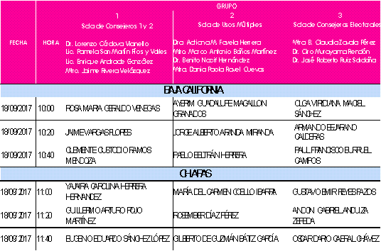 Una vez conformados los grupos de Consejeros Electorales, de conformidad con el Punto de Acuerdo Segundo del Acuerdo INE/CG220/2017, el Consejo General aprobó la vigencia de los Acuerdos INE/CG180/2017 e INE/CG219/2017 para las Convocatorias, por lo que en atención a lo anterior se procedió al desahogo de cada una de las entrevistas programas, sobre la base de los criterios establecidos en el referido Acuerdo.