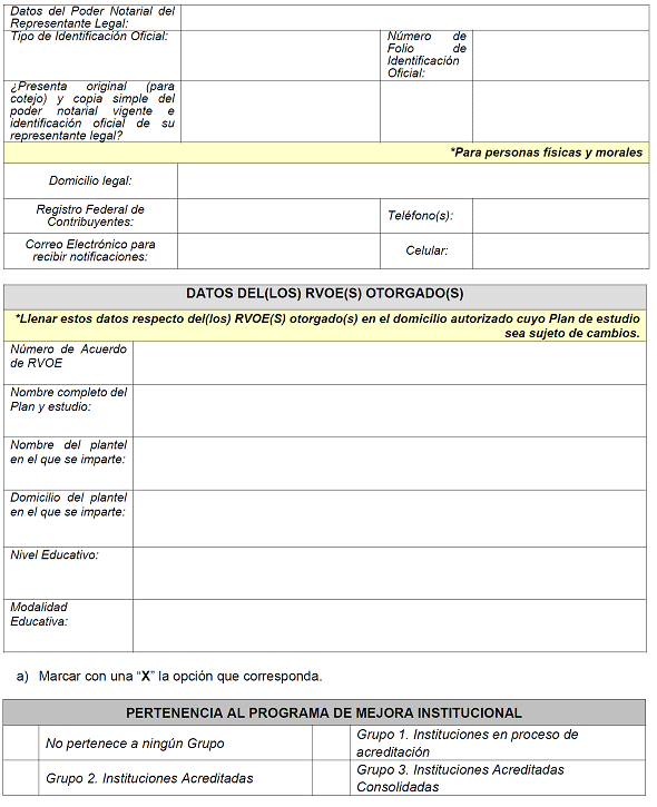 | 18 | Estado de los cubículos destinados a la impartición del Plan y Programas de estudio objeto de RVOE | NO | Texto | No aplica, se selecciona del catálogo | Seleccionar: Bueno, Regular o Malo. |