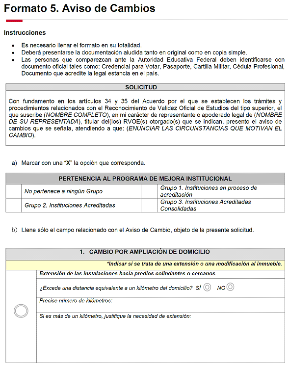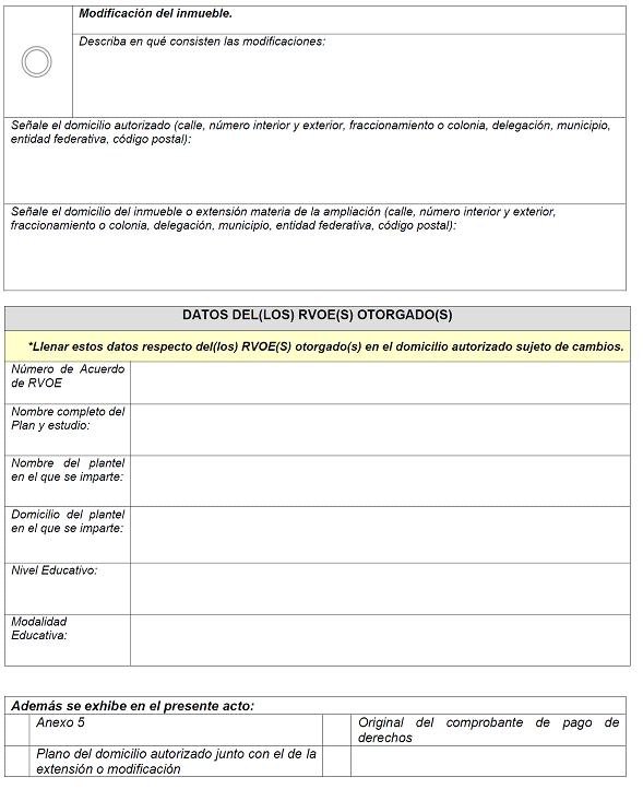 | 11 | Estado de las Aulas destinadas que serán destinadas a la impartición del Plan y Programas de estudio objeto de RVOE | SÍ | Texto | No aplica, se selecciona del catálogo | Seleccionar: Bueno, Regular o Malo. No es obligatorio para la modalidad no escolarizada. |