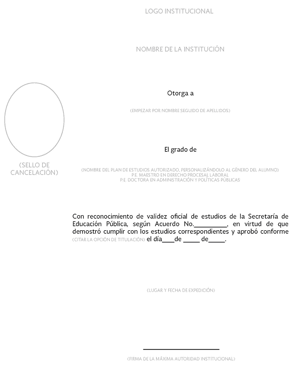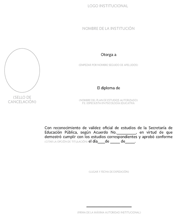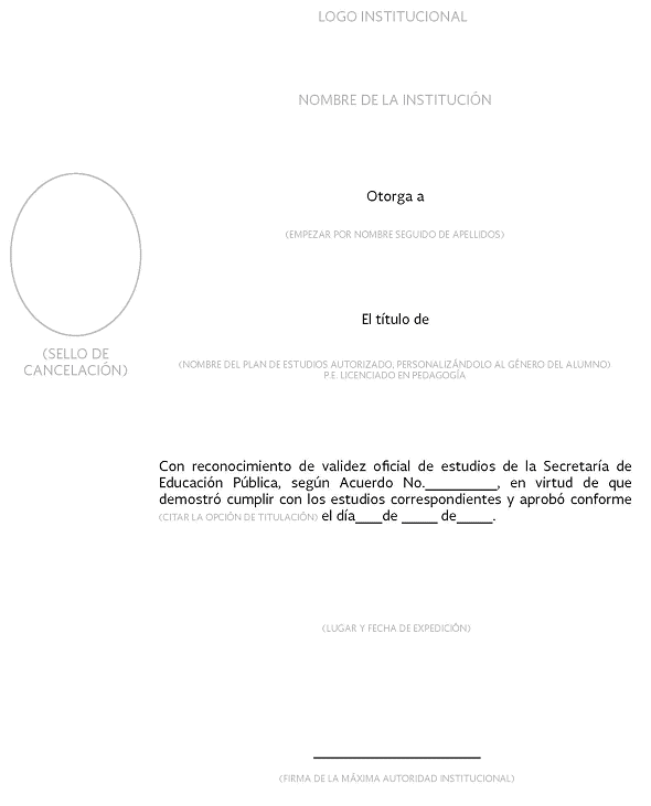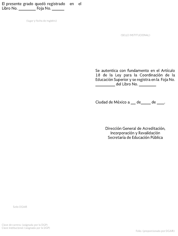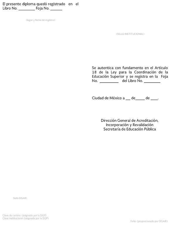 | 7 | Folio del documento | NO | Texto | 20 caracteres | Indicar el folio que la institución educativa haya asignado al documento al momento de su expedición. (No es el folio de autenticación). |