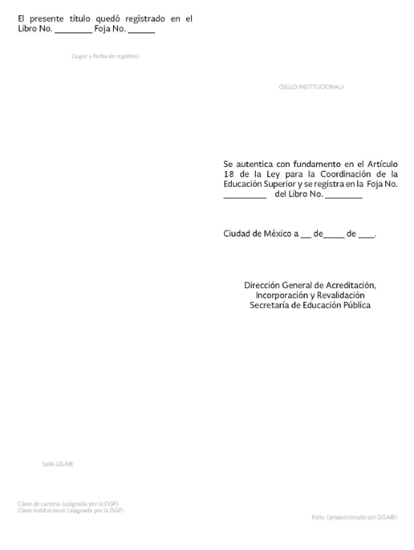 | 19 | Clave de Carrera | SÍ | Texto | 10 caracteres | Señalar la clave proporcionada por la Dirección General de Profesiones de la SEP. |