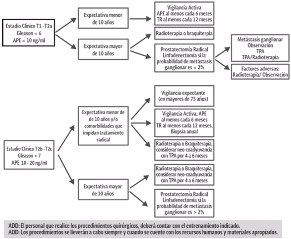 | NCCN | cT1c, GS <7, APE < 10, APED < 0.15, < 3 cilindros positivos | APE <10, GS <7, cT1-2a | APE 10-20, GS 7 o cT2b-2c | APE >20, GS >7 o cT3a | cT3b-4 |