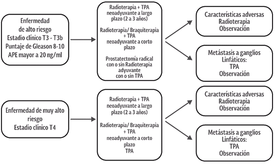 | El riesgo de recurrencia en pacientes sometidos a terapia definitiva se encuentra directamente proporcional en relación a diversos factores que incluyen: tumores de alto grado (Gleason mayor a 7), Etapa T elevada (T3 o mayor), niveles de APE pretratamiento mayores a 10 ng/ml. Márgenes quirúrgicos positivos, Invasión a vesículas seminales, infiltración capsular y ganglios positivos. Tipos de Recurrencia: Recurrencia bioquímica. Implica únicamente la elevación de APE post tratamiento. Implica un volumen tumoral escaso como para ser visualizado con técnicas de imagen. Casi siempre constituye el primer signo de recidiva. Recurrencia local. Cáncer identificado en la glándula prostática o en su cercanía (posterior a RT o ablación); en la proximidad de la anastomosis uretral (posterior a PR). Recurrencia a distancia: Cáncer identificado en órganos distantes. Recurrencia clínica. Recurrencia en cualquier sitio, en presencia de sintomatología. Recurrencia post RT. Efecto "rebote" post RT. Constituye una condición benigna en la cual existe una elevación de APE post RT, que puede durar de 6 a 18 meses. Puede ser inducida por inflamación tisular y daño celular, y usualmente no rebasa la cifra de APE de 1 ng/ml. Sin embargo, debe vigilarse ya que también incrementos mayores a 1.4 ng/ml, se encuentran relacionados con recurrencia real. Los criterios de recurrencia post RT incluyen: Elevación de APE de 2 ng/ml o mayor por encima del valor nadir del APE. Recurrencia local, evidenciada por BTR positiva posterior a 18 meses de la RT. Recurrencia sistémica. Cuando se detecta recurrencia en pacientes sometidos a RT con intento curativo, puede considerarse la terapia de rescate con fines curativos que incluye: PR de rescate, crioterapia, braquiterapia, ADT (ver apartado de terapia hormonal) y vigilancia. Prostatectomía de rescate. Los candidatos ideales incluyen aquellos con criterios como etapa clínica T1 T2, N0M0, Gleason menor a 7, APE menor a 10 ng/ml, expectativa de vida mayor de 10 años, así como TD-APE largo. Existen dificultades técnicas y mayor tasa de complicaciones en relación a la PR primaria, incluyendo lesión rectal, incontinencia, mayor sangrado, estenosis anastomótica y disfunción eréctil Recurrencia post postatectomía radical se presenta con los siguientes criterios: Recurrencia bioquímica. Es definida como un APE de más de 0.2 ng/ml seguida de una confirmación del mismo valor en el lapso de 2 semanas. También se incluyen pacientes con APE detectable, que incrementa en 2 o 3 determinaciones consecutivas con diferencia de una semana entre ellas. Biopsia positiva en la región de la anastomosis vesicouretral (recurrencia local). Metástasis distantes (recurrencia sistémica). El 45% de las recurrencias se presentan en los siguientes 2 años de la PR; 77% a los 5 años y 96% a los 9 años. Las opciones de tratamiento para la recurrencia local incluyen radioterapia externa, ADT y vigilancia. LA RT de rescate habitualmente es tolerada adecuadamente. Existe disminución en la potencia sexual, sin embargo, no existe un impacto significativo en la continencia cuando ésta se ha recuperado de manera adecuada en el postoperatorio. La dosis debe ser al menos de 64 Gy. El candidato ideal para la RT de rescate incluye pacientes con APE menor a 1.5 ng/ml al inicio de la RT, recurrencia de 1 a 2 años posterior a la PR; así como la velocidad de duplicación de APE. Otros factores incluyen el puntaje de Gleason menor a 7, ausencia de compromiso de vesículas seminales y ganglios linfáticos. |