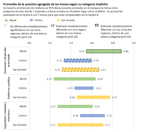 Para complementar los resultados de la primera pregunta abierta, se muestra la posición promedio de los temas clasificados en cada una de las siguientes categorías: Gobierno y Política, Seguridad y Relaciones Exteriores, y Economía y Desarrollo Sustentable. Se observa que en el norte los temas dentro de la categoría