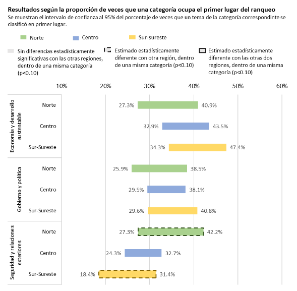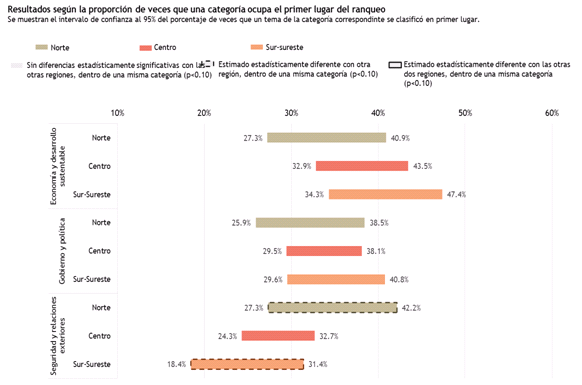 En el agregado, la región del centro se mantiene en empate técnico con el sur en cuanto a Economía y Desarrollo Sustentable, ocupa un lugar intermedio para Gobierno y Política, y los temas de Seguridad y Relaciones Exteriores se tienden a posicionar por debajo de las otras dos regiones.