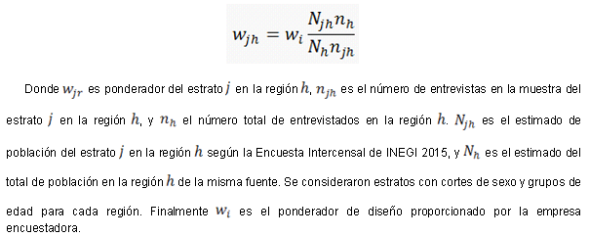 Para realizar estimaciones con cortes regionales entre norte, centro y sur-sureste a partir de la muestra con representatividad nacional, la CNCS utilizó ponderadores regionales calculados de la forma siguiente: