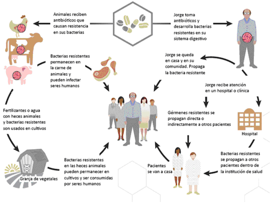 Así mismo, dicha ilustración es una propuesta que muestra la forma como se puede iniciar la aparición de bacterias resistentes en humanos y animales, así como algunos medios de transmisión de microorganismos o factores de resistencia entre diferentes individuos.