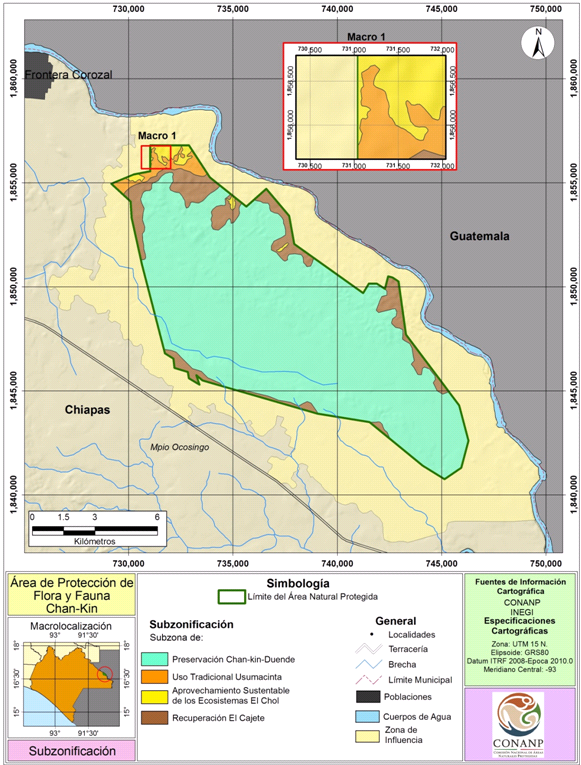| Subzona de Preservación Chan-Kin-Duende | · Superficies en buen estado de conservación. · Ecosistemas relevantes o frágiles del Área de Protección de Flora y Fauna Chan-Kin, como la selva alta perennifolia y el popal-tular-tintal. · Presencia de especies de flora en peligro de extinción según la Norma Oficial Mexicana NOM-059-SEMARNAT-2010, como la especie conocida localmente como jobillo (Astronium graveolens), y la especie conocida localmente como palo chombo (Guatteria anomala) y palo blanco (Tabebuia chrysantha). · Distribución de especies de maderas de alto valor comercial como el cedro (Cedrela odorata) y la caoba (Swietenia macrophylla). · Hábitat de especies de fauna sujetas a protección especial: el mico de noche, kinkajou (Potos flavus), el cacomixtle tropical (Bassariscus sumichrasti) y el zorrillo narigón rayado (Conepatus semistriatus), con base en la Norma Oficial Mexicana NOM-059-SEMARNAT-2010. · Servicios ambientales como regulación climática, hídricos (conservación de los ciclos hidrológicos, control de inundaciones, recarga de acuíferos), formación de suelo, captura de carbono, control de la erosión y mantenimiento de la biodiversidad. |