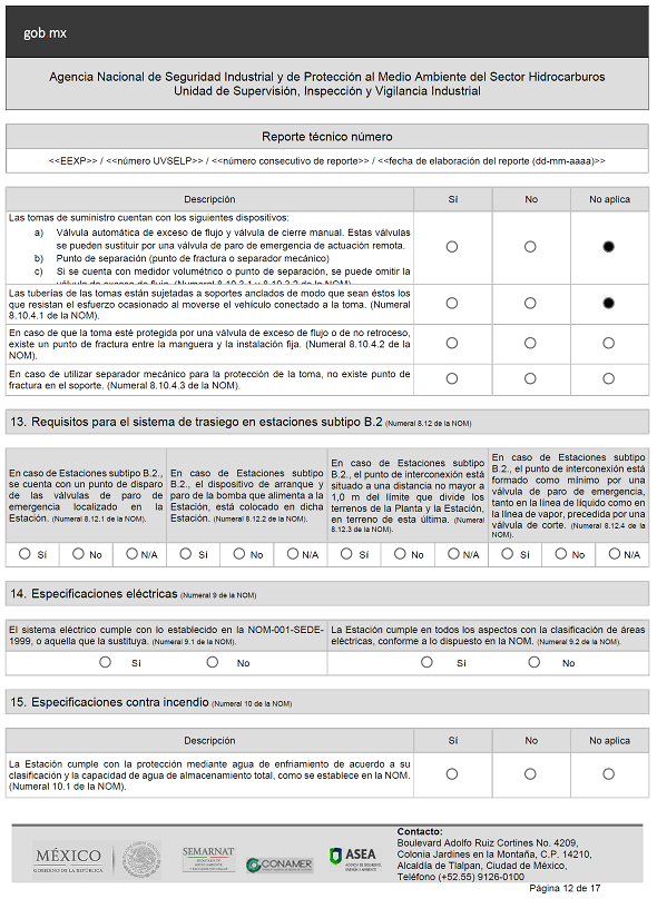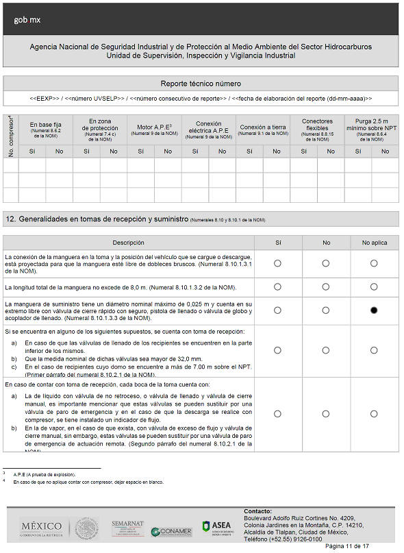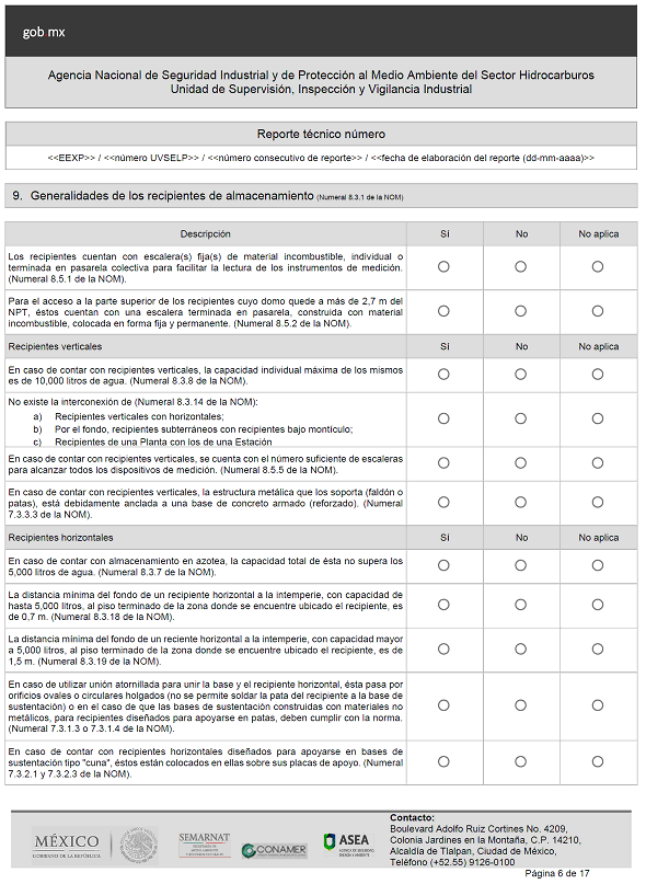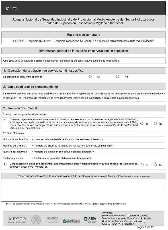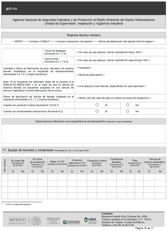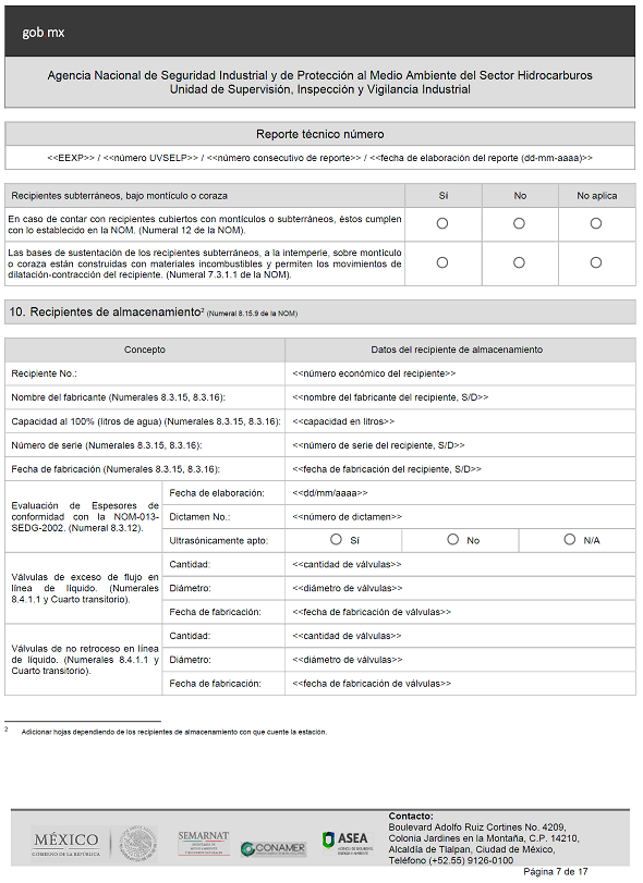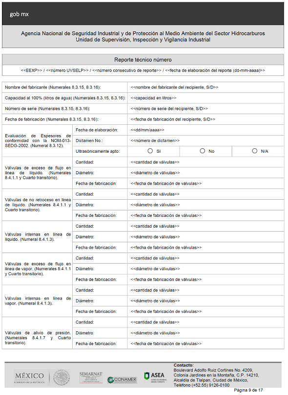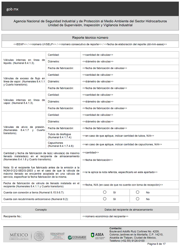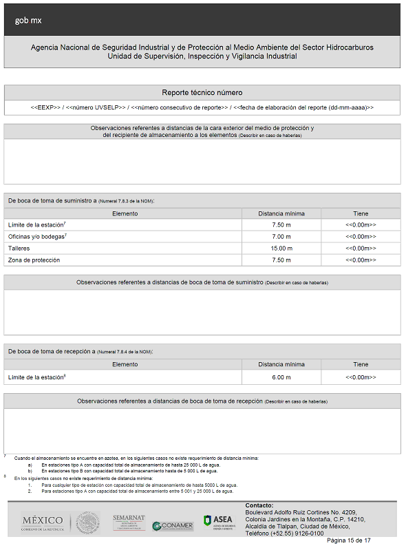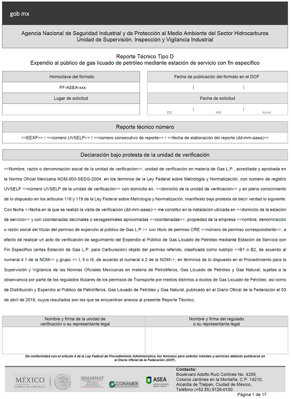 SEGUNDO.- El formato único de REPORTE TÉCNICO TIPO D -Expendio al Público de Gas Licuado de Petróleo, mediante Estación de Servicio con Fin Específico, se encuentra en el Anexo del presente Acuerdo y el estricto apego al mismo para los fines requeridos es responsabilidad de las unidades de verificación correspondientes.