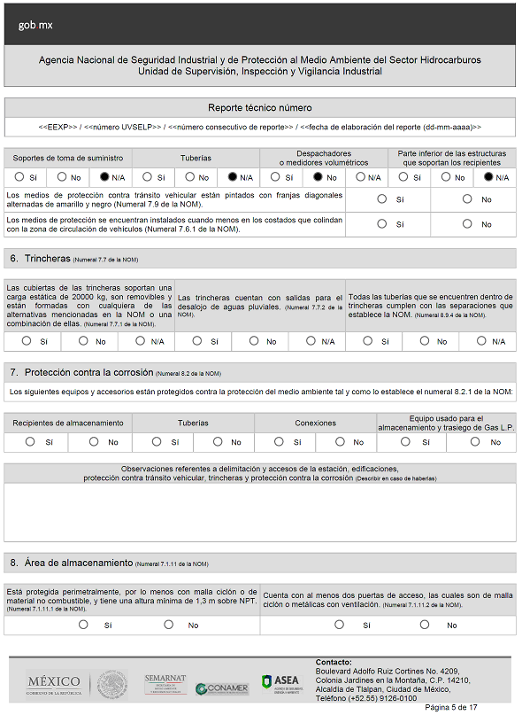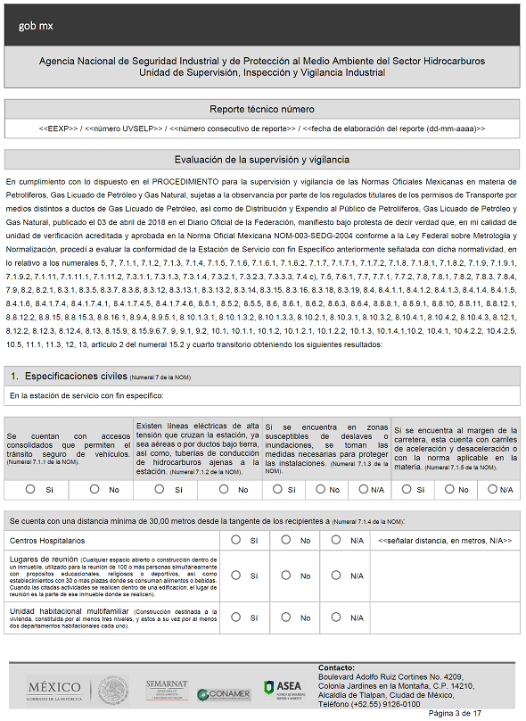 Que de conformidad con lo previsto en el numeral 5.2.2 y Cuarto Transitorio del PROCEDIMIENTO para la supervisión y vigilancia de las Normas Oficiales Mexicanas en materia de Petrolíferos, Gas Licuado de Petróleo y Gas Natural, sujetas a la observancia por parte de los regulados titulares de los permisos de Transporte por medios distintos a ductos de Gas Licuado de Petróleo, así como de Distribución y Expendio al Público de Petrolíferos, Gas Licuado de Petróleo y Gas Natural, publicado el 3 de abril de 2018, en el Diario Oficial de la Federación, corresponde a la Agencia Nacional de Seguridad Industrial y de Protección al Medio Ambiente del Sector Hidrocarburos, la publicación del formato único de REPORTE TÉCNICO TIPO D -Expendio al Público de Gas Licuado de Petróleo, mediante Estación de Servicio con Fin Específico.