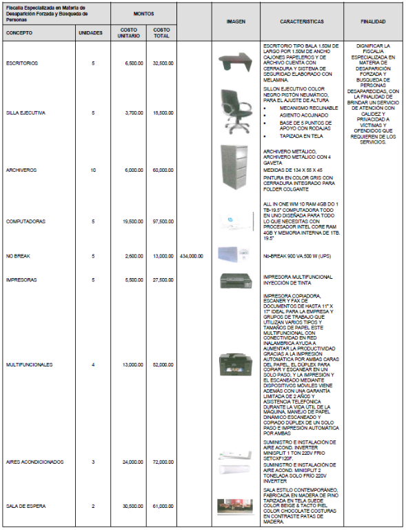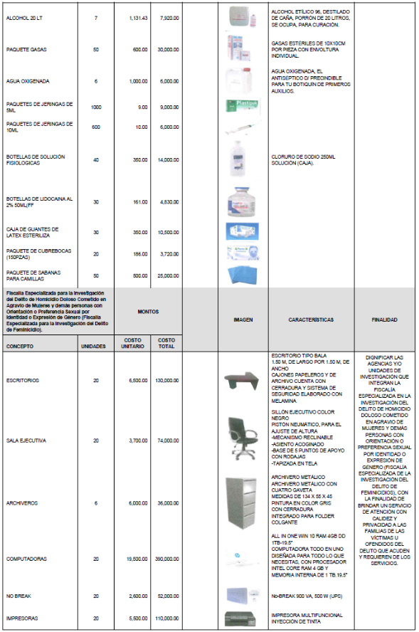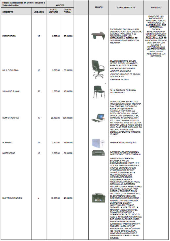 | 6.5 Equipamiento de la Fiscalía Especializada para la Investigación del Delito de Homicidio Doloso cometido en agravio de Mujeres y demás personas, con orientación o preferencia sexual por identidad o expresión de Género, con el propósito de cumplir con sus funciones sustantivas. Cometido en agravio de Mujeres y demás personas, con orientación o preferencia sexual por identidad o expresión de Género (Fiscalía Especializada para la Investigación del Delito de Feminicidio) y a sus 6 unidades de investigación especializadas adscritas, localizadas en las diferentes regiones del Estado; con la finalidad de dar cumplimiento de las funciones sustantivas y proporcionar atención a usuaria/os. | Comprobación de adquisición/Evidencia fotográfica de la compra de material y equipo/ listado de asignación de material y equipo a personal asignado a cada Fiscalía. | | | | | | | | | | | | | $1,084,000.00 |