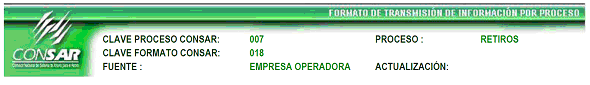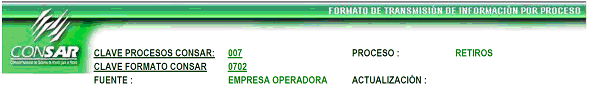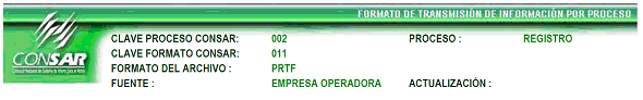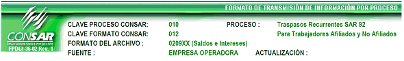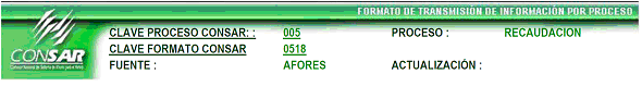 | 4 | 3 Caracteres numéricos | Clave del Proceso Según Catálogo de Procesos (Definido en el encabezado CLAVE PROCESO CONSAR) |