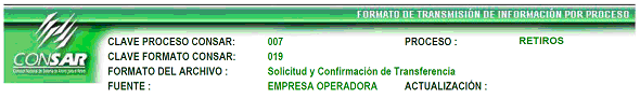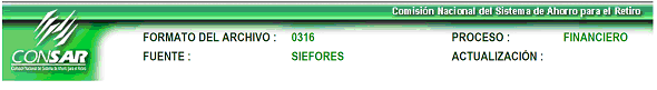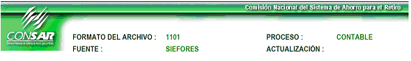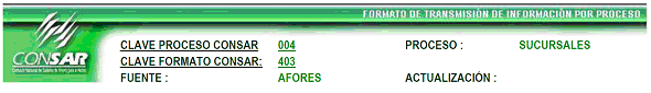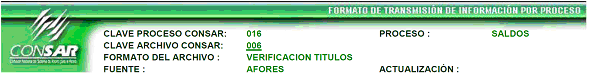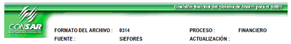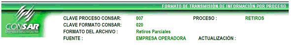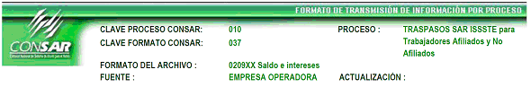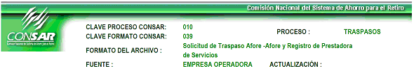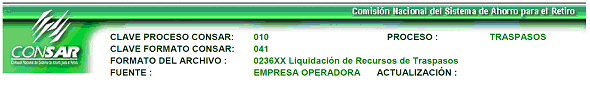 | 6 | 3 Caracteres numéricos | Clave del formato Según CONSAR (Definido en el encabezado CLAVE FORMATO CONSAR) |