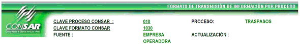 | 2 | Identificador de Servicio | N | 2 | 0 | 3 | 4 | Traspaso1. Constante= 02' |