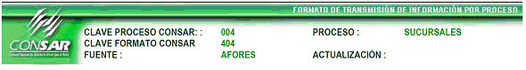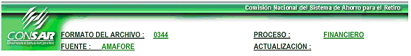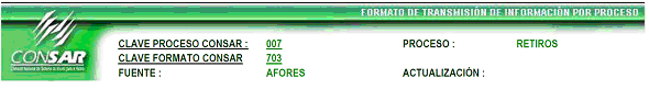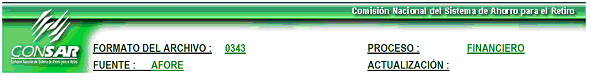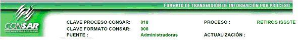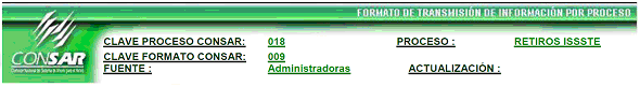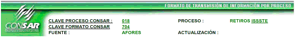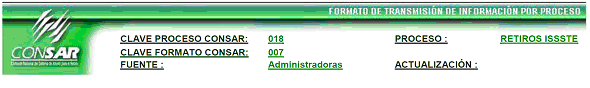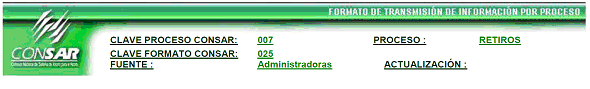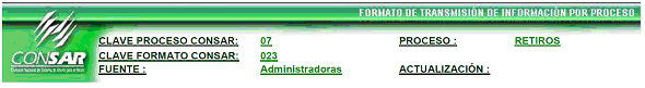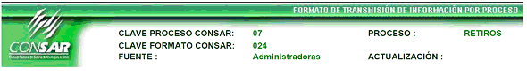 | 7 | Fecha de Conclusión de Vigencia | F | 8 | 0 | 56 | 63 | Fecha en que concluye la Vigencia de las Autorizaciones para Retiro Parcial de Recursos.3 |