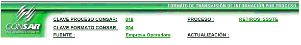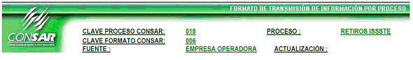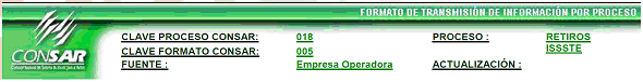 | 11 | Tipo de Retiro | AN | 1 | 0 | 151 | 151 | De acuerdo al Catálogo de Tipo de Retiro ISSSTE del Catálogo General vigente. 5 |