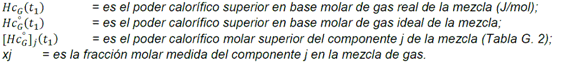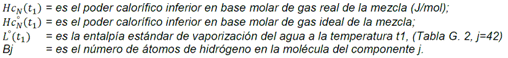 | Nota 1: Todos los valores de la Tabla G. 2 han sido tomados de la norma ISO 6976:2016 Nota 2: El valor en la Tabla para el agua (j=42) representa su entalpía molar de vaporización (no su poder calorífico). Esta entalpía es necesaria para realizar el cálculo de poder calorífico inferior al considerar la cantidad de vapor de agua en la muestra de gas de entrada. |