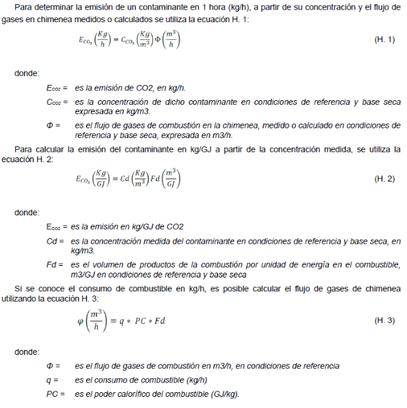 Los métodos de medición indicados para los contaminantes gaseosos miden directamente su concentración en los gases de combustión. En forma simultánea se debe medir o calcular el flujo de gases en la chimenea, (), así como la concentración de oxígeno (O2) para corregir los resultados a las condiciones de referencia de 25°C, 1 Atm y 5% de O2, base seca.