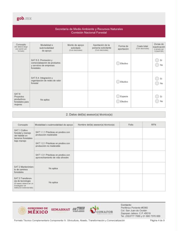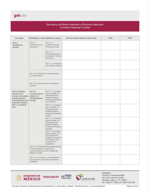 | SAT.5.4 Integración y organización de redes de valor forestal | 300,000 | II, III, IV y Empresas Forestales | 1 | 2 Persona Física y 4 Persona Moral | Desarrollo de la Cadena Productiva o Certificado FIRA, FND |