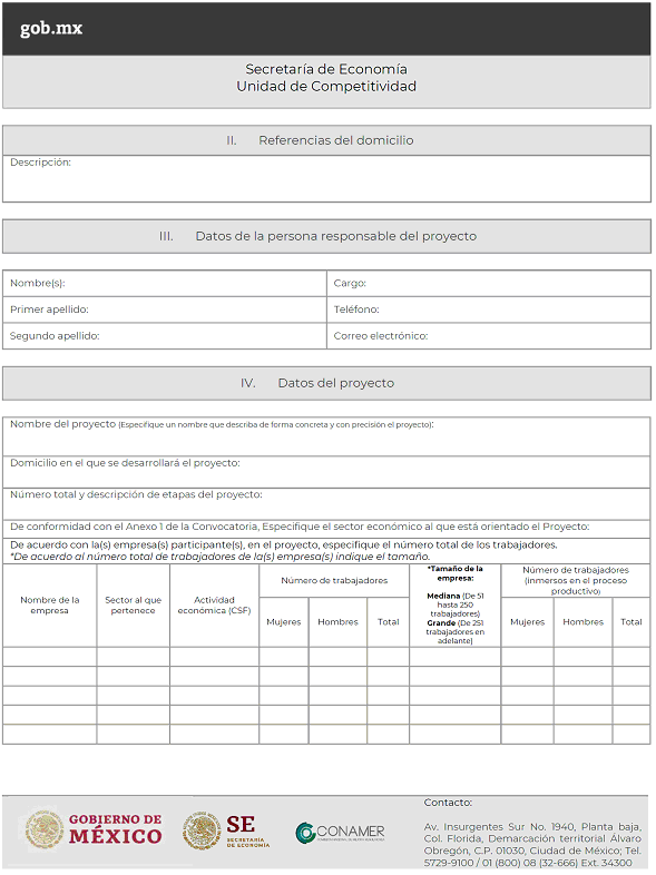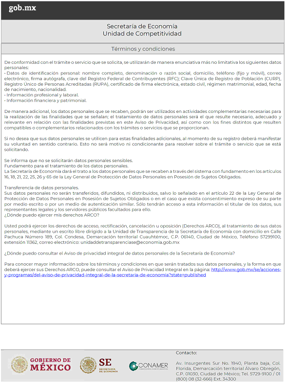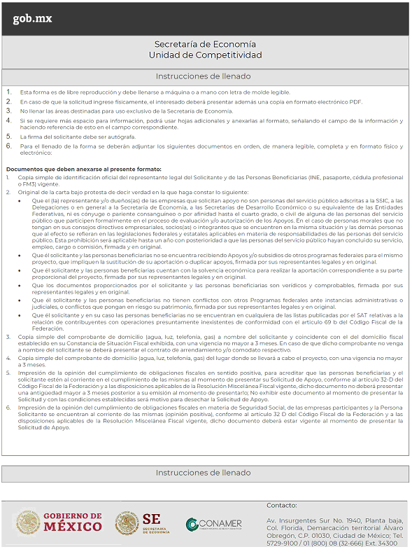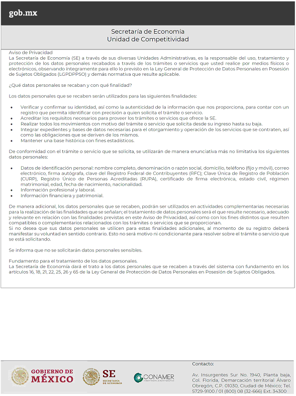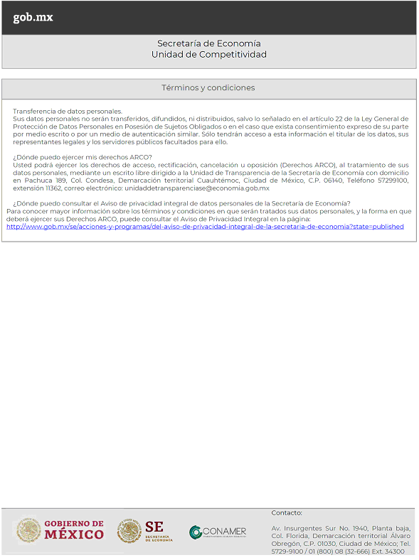 · La ventanilla de recepción de la Unidad de Competitividad, ubicada en Avenida Insurgentes Sur No. 1940, Planta Baja, Colonia Florida, Demarcación Territorial Álvaro Obregón, C.P. 01030, Ciudad de México. De lunes a viernes de 9:00 a 14:30 horas y de 16:00 a 18:00 horas.