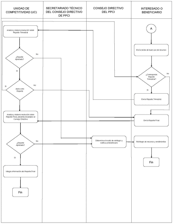| 16. | UC | Analiza y elabora una resolución sobre el Reporte final. La UC podrá solicitar información adicional o complementaria para valorar el cumplimiento de los objetivos del proyecto o programa apoyado, así como llevar a cabo las inspecciones físicas y revisión documental necesarias. La UC presentará estos resultados al Consejo Directivo. | Reporte final validado | Resolución sobre Reporte final |